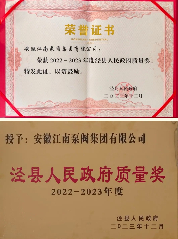 喜報!江南泵閥集團榮獲“涇縣人民政府質(zhì)量獎”